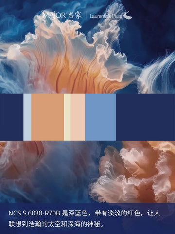 一抹深邃带红色底的蓝,像浩瀚宇宙与神秘深海的交融。 局部涂刷在强功能性的空间墙面上, 带有沉浸式氛围,神秘又令人心驰神往。