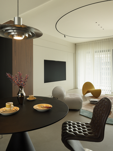 沐浴在柔和自然光中,客餐厅在形与材质的对话中徐徐展开。雕塑感吊灯在哑黑圆桌上投下温暖光晕,阳光色调的精致餐具为场景增添了细腻的温度。温润的胡桃木墙板与纯净的冰川白墙面相互映衬,天花的圆形线条成为空间里低调而独特的建筑焦点。